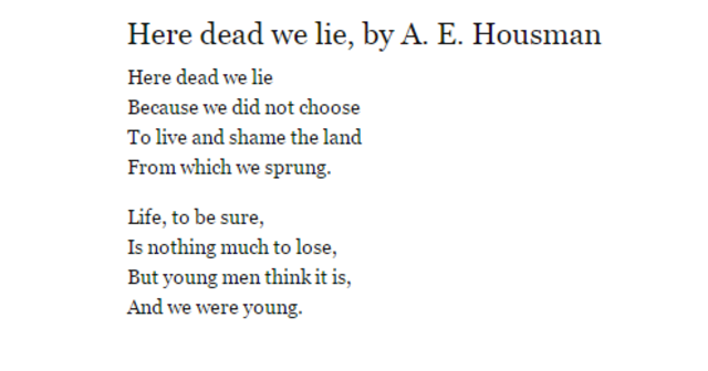 Here Dead We Lie. Housman I made sure to decode every word that the poems contained in order to self-interpret the pieces of literature. Here dead we lie Because we did not choose To live and shame the land From which we sprung.